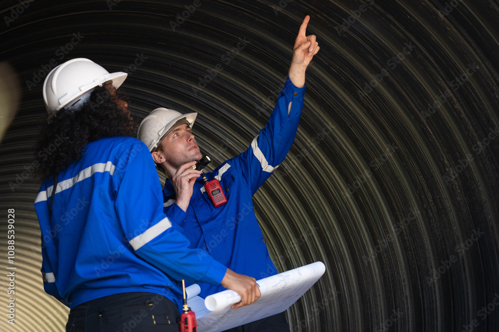 Two Heavy Industry Engineers Walking Inside Pipe Checking Welding. Construction of the Oil, Natural Gas and fuels Transport Pipeline. Industrial Manufacturing Factory.