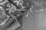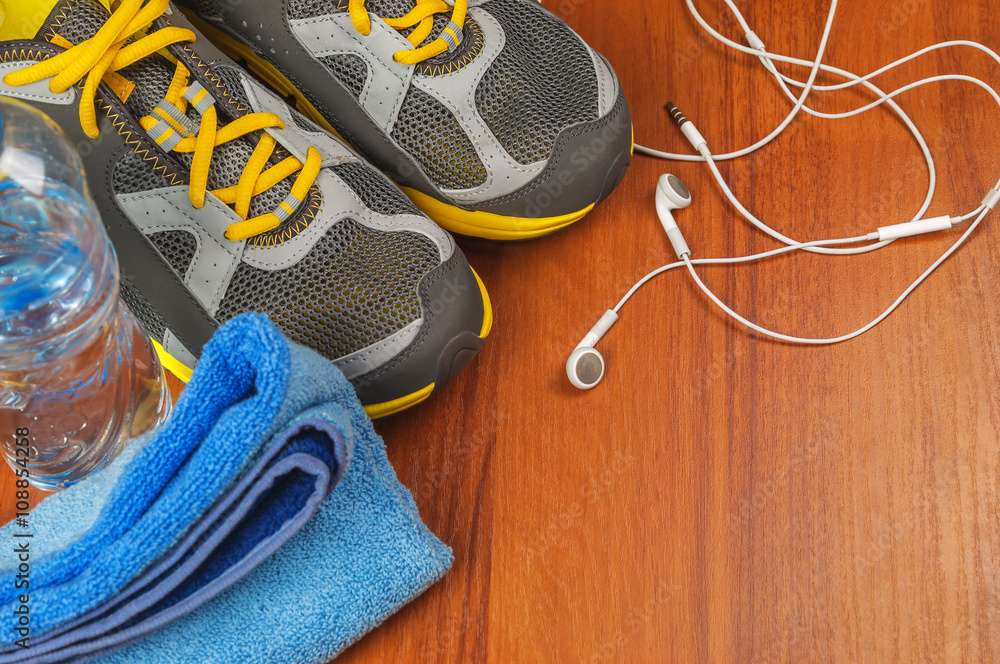 headphones, sport shoes and towel