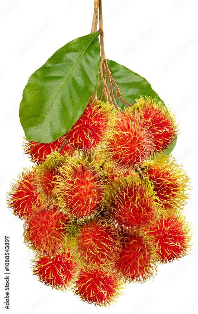Rambutan, a sweet red tropical fruit with green leaves ion white background PNG File .