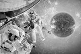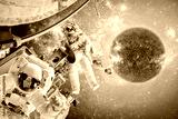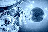 Spacecraft and astronauts in space on background sun star