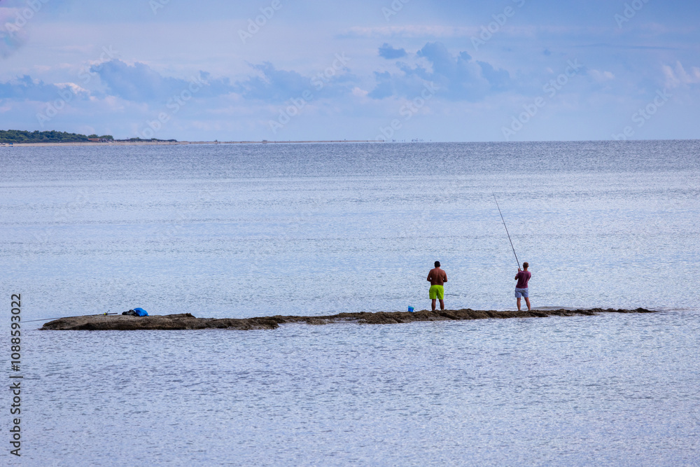 This image captures two fishermen standing on a rocky outcrop, fishing amidst the tranquil waters, creating a serene and picturesque coastal scene.
