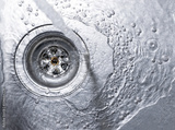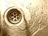 Running water drains down a stainless steel sink