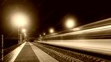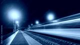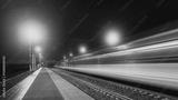 Modern railway at night. Light trail of high speed train in railroad station. Moving modern intercity passenger train.