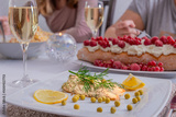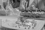 Alkohol, wino i kieliszek oraz wyśmienite jedzenie na stole na imprezie z okazji uroczystości wydarzenia towarzyskiego i świąt.