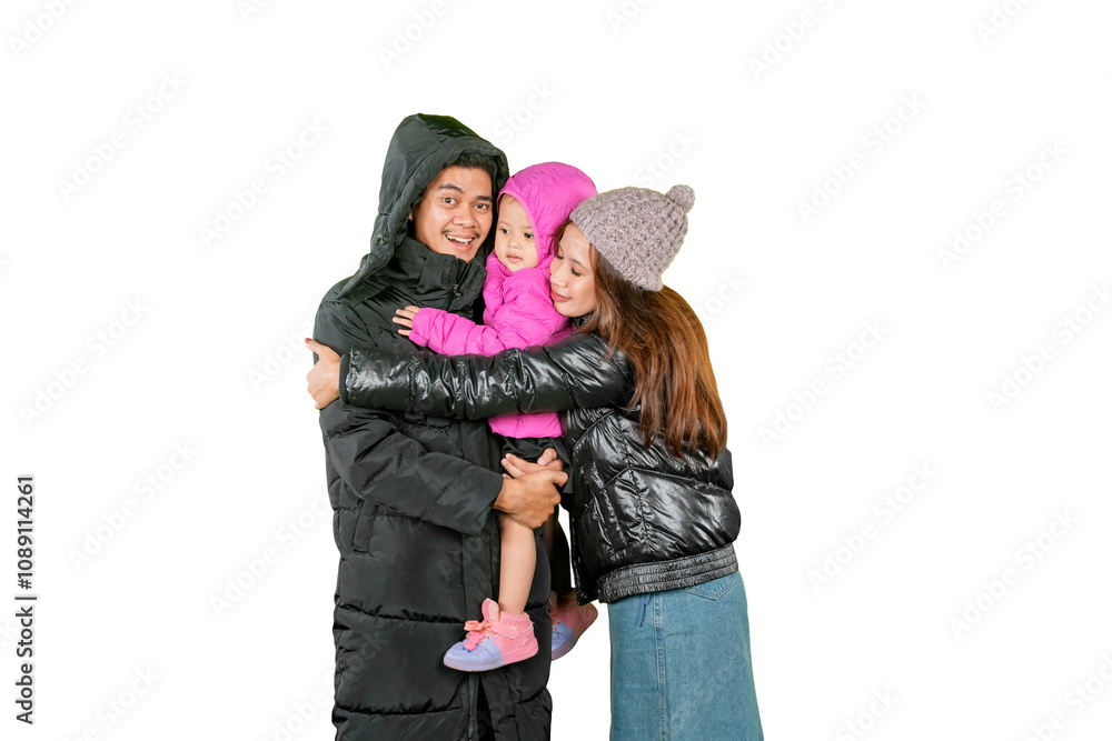 Happy Family Hugging in Winter Outfits on Isolated Background