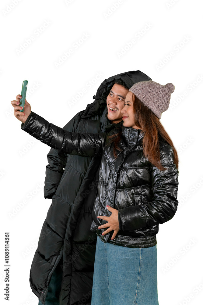 Smiling Couple in Winter Clothing Taking a Selfie Together