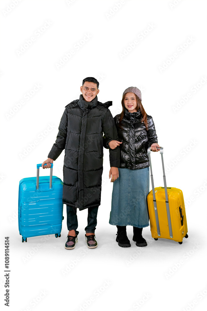Traveling Couple in Winter Clothing with Luggage on White Background
