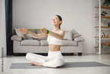 Brunette fit woman in white leggins and top working out on mat at home