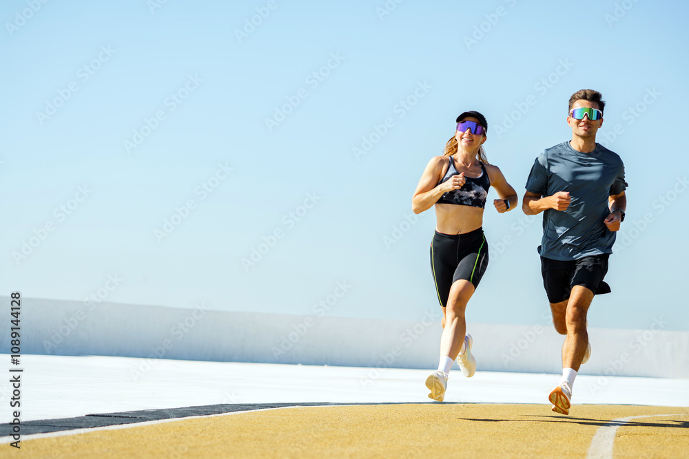 Two Athletes Running on a Bright Outdoor Track During a Sunny Morning Workout Session