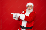 Funny happy excited old bearded Santa Claus face wearing costume looking at camera showing pointing fingers aside advertising Christmas promotion, New Year xmas discount ad isolated on red background.