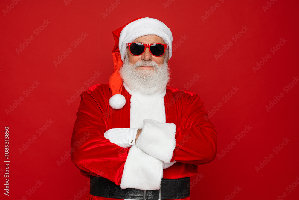 Portrait of confident senior bearded Santa Claus wearing hat, glasses, coat, costume arms crossed folded looking at camera on Merry Christmas, Happy New Year isolated standing on red background.