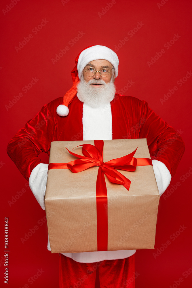 Vertical shot of happy funny old bearded Santa Claus wears costume holds present, Merry Christmas giftboxes wrapped with red ribbon, giving gift box isolated on red xmas background.