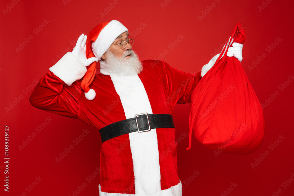 Shocked amazed excited man pensioner dressed santa claus costume carrying big christmas sack smiling isolated red color background. Merry Christmas New Year concept