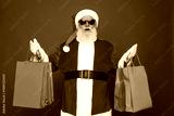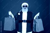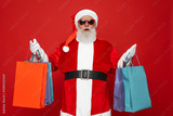 Portrait of his he nice attractive cheerful cheery fat Santa holding in hands carrying things buyings retail store boutique black Friday isolated bright vivid shine vibrant red color background