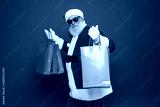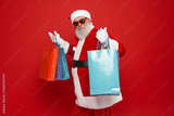 Christmastime winter noel eve aged mature stylish grandfather Nicholas in tradition headwear costume spectacles with white beard hold color buy bags in hands isolated on red background