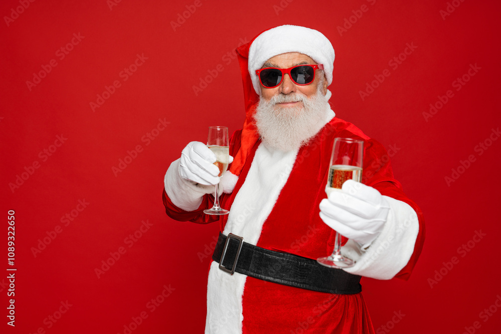 Photo of retired old man grey beard funky holding two full glasses golden wine having fun wear santa x-mas costume suspender sunglass cap isolated red color background. Merry Christmas New Year