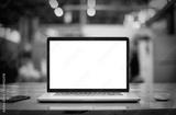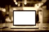 Laptop with blank screen on wooden table in bright office. Computer mockup