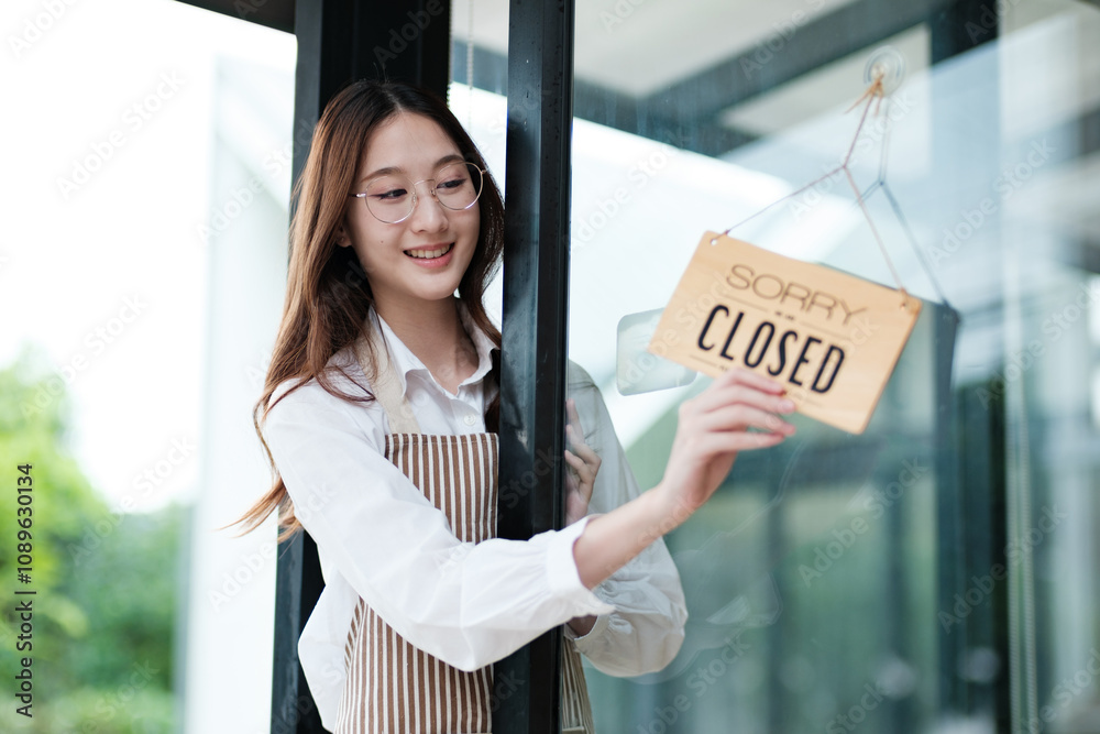 A shopkeeper flipping an open sign at the storefront, letting customers know the shop is now open. The scene highlights the start of a welcoming and professional business day in a retail or cafe.
