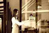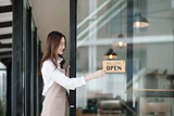 A shopkeeper flipping an open sign at the storefront, letting customers know the shop is now open. The scene highlights the start of a welcoming and professional business day in a retail or cafe.