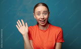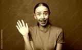smiling happily and cheerfully, waving hand, welcoming and greeting you, or saying goodbye