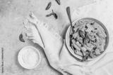 Italian rigatoni pasta with creamy pumpkin sauce, fresh spring onions and parmesan cheese