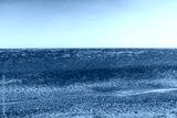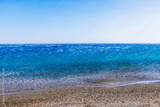 Calm Aegean Sea waves reaching pebble beach under clear blue sky on sunny summer day on Crete island.