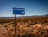 A blue road sign in the desert with the word Attraction with an arrow pointing to the right against a blue sky