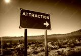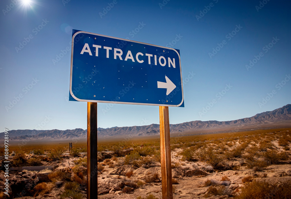 A blue road sign in the desert with the word Attraction with an arrow pointing to the right against a blue sky