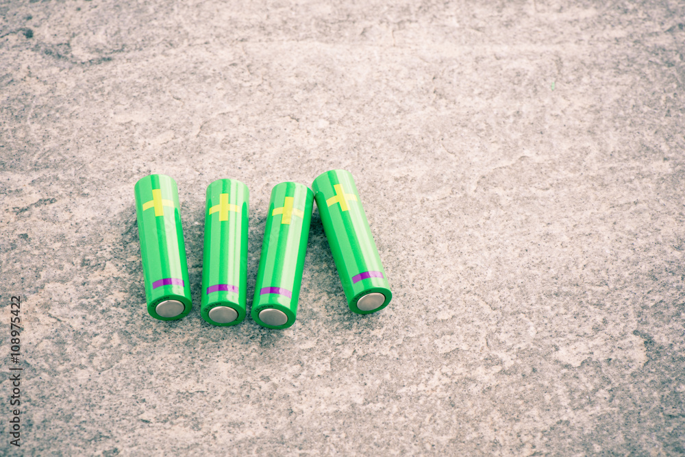 Green battery. AA batteries, concept of power, energy, electricity and recycling. Power supply used for technology objects.