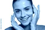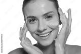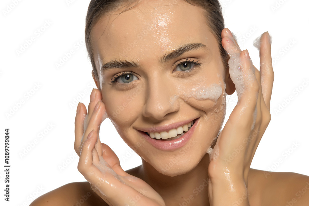 Young beautiful happy woman washing her face in soap foam.