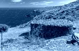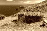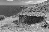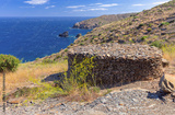 Stone hut against the backdrop of the coastal landscape and the lighthouse of Cala Nans, Cadaques, Spain