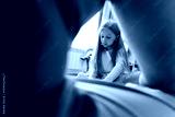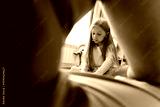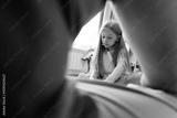 A young girl sits on the floor, looking down thoughtfully, from a low-angle perspective