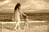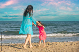 Young happy woman with little daughter dancing holding hands on the beach. Mother's Day concept