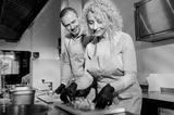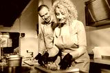 Middle-aged couple enjoying a cooking class with a chef preparing mushrooms for a meal in the kitchen.