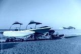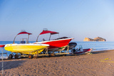 Motor boats for parasailing are on the coast at the Water Sports station