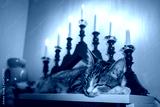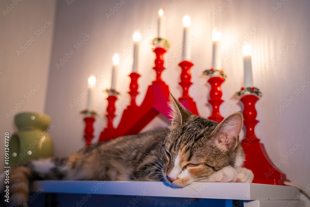 Cat resting on a shelf in front of lit candles during a cozy evening at home