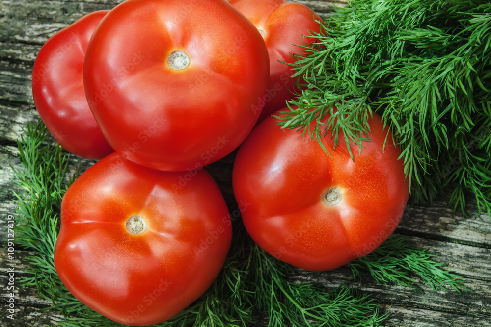 Flat lay of fresh tomatoes and dill on wooden table. Ingredients for salad. Close up. Top view