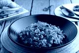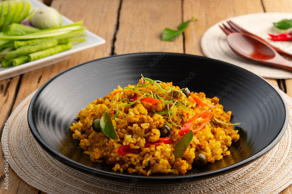 Southern Thai Yellow Curry Paste Fried Rice with ground pork in black plate.(khao pad Kuo Kling)