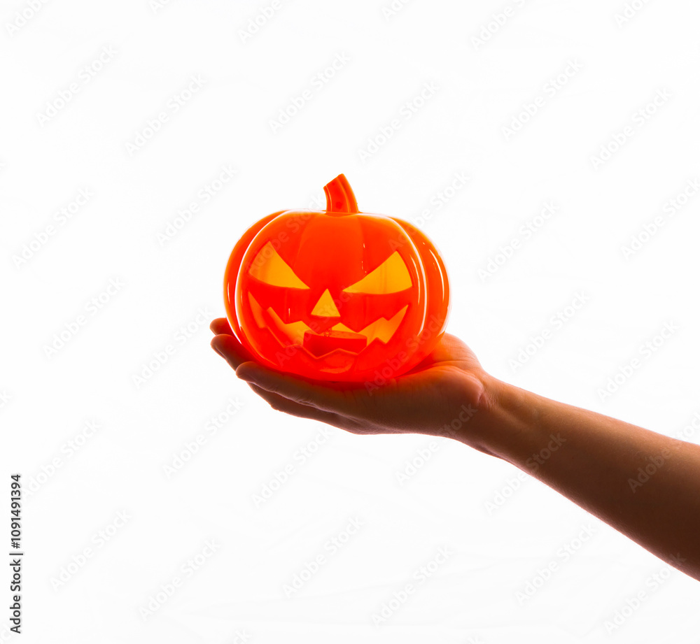 Halloween photo. Halloween pumpkin. Hands. White background. Holidays. Fall.
