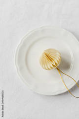 Winter holiday preparation with modern Christmas ornament and tableware for elegant Christmas table setting. Elegant dishes with paper balls