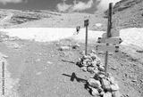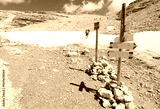 Sign with arrows on a high mountain trail in the Italian Alps with directions to alpine huts and other locations