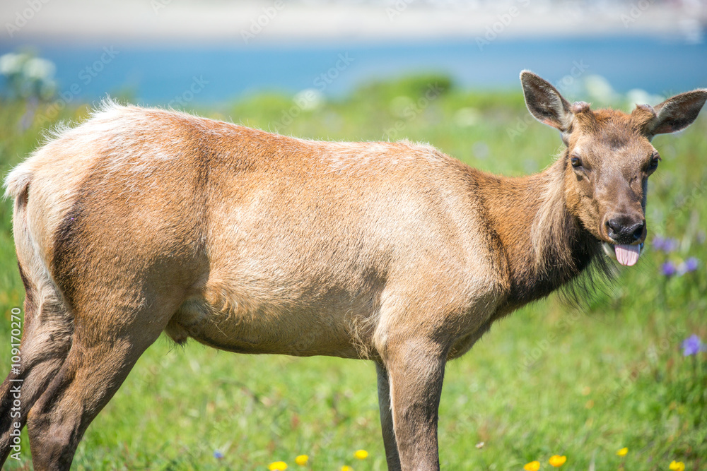 Tule Elk (Cervus canadensis nannodes) bull with new antlers grazing and sticking out tongue. Tomales Point, Point Reyes National Seashore, Marin County, California, USA.