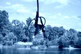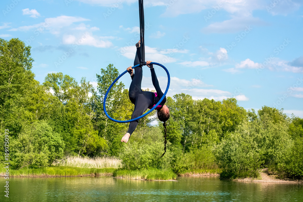 An aerial gymnast performs using a rope against the background of nature.