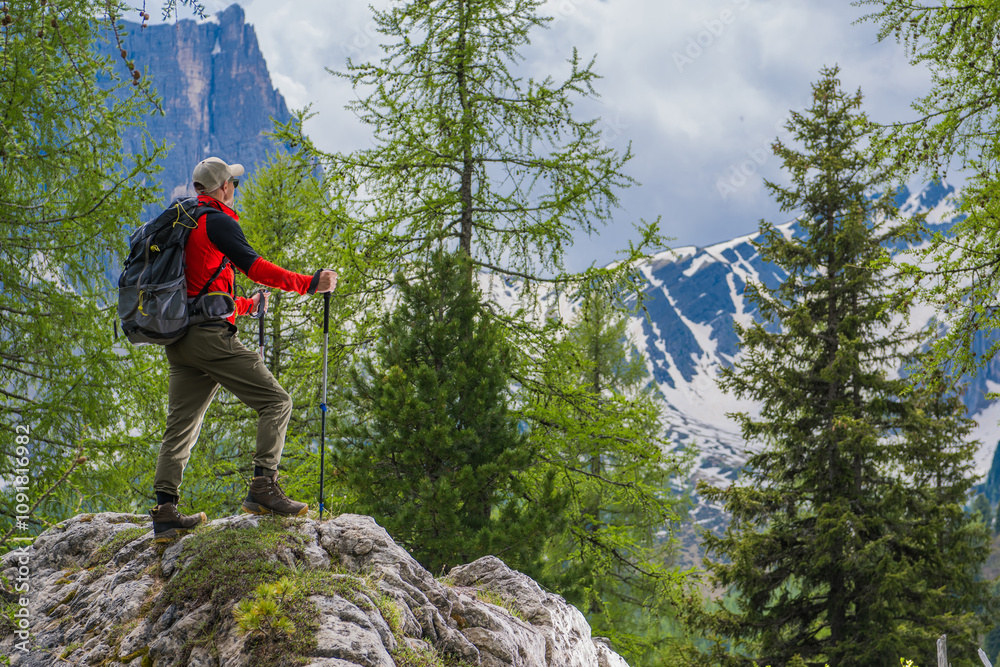 Hiker Enjoying Scenic View From Rocky Outcrop in the Mountains During Overcast Day