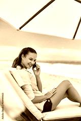 Portrait Of Beautiful Happy Smiling Woman Using Cell Phone, Talking On Telephone While Relaxing On Sun Lounger On Beach By The Sea. Girl On Summer Vacation. Mobile Communication, Connection Concept