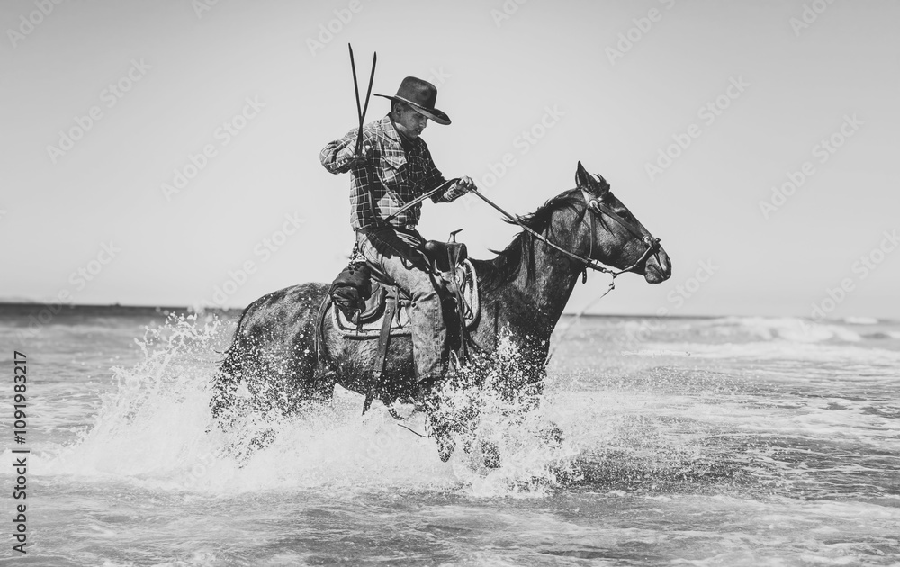 Black and white image of a man riding a horse in the ocean wearing cowboy hat