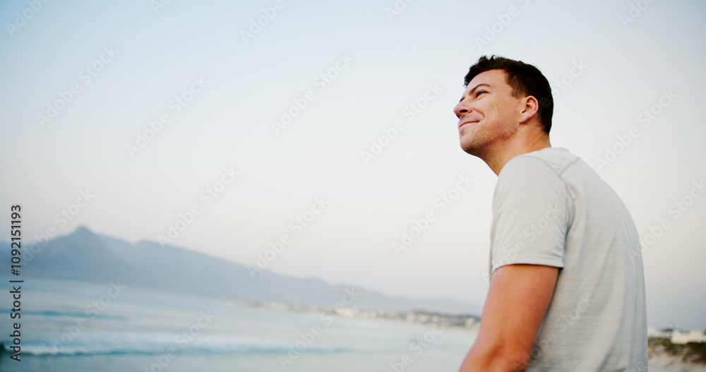 Man, thinking and beach sand for vacation, travel and outdoor for peaceful waves in nature. Male person, dream and weekend for calm adventure on tropical island, contemplating and earth for freedom