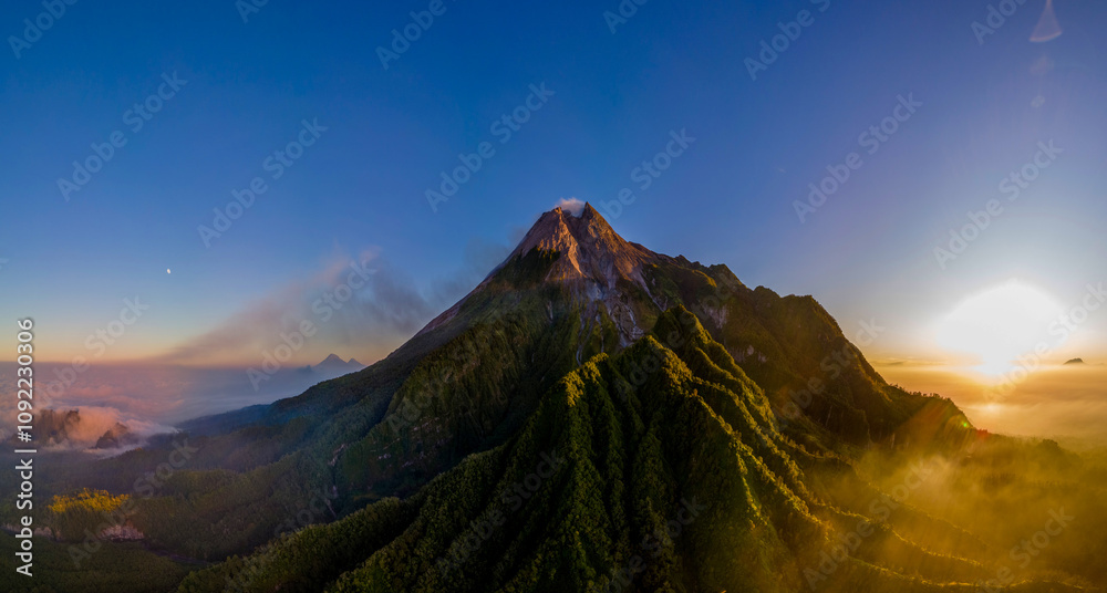 Aerial panoramic view of Mount Merapi, an active volcano in Central Java, Indonesia. Captured in the morning light with lush tropical forest and dramatic ridges. Drone photography