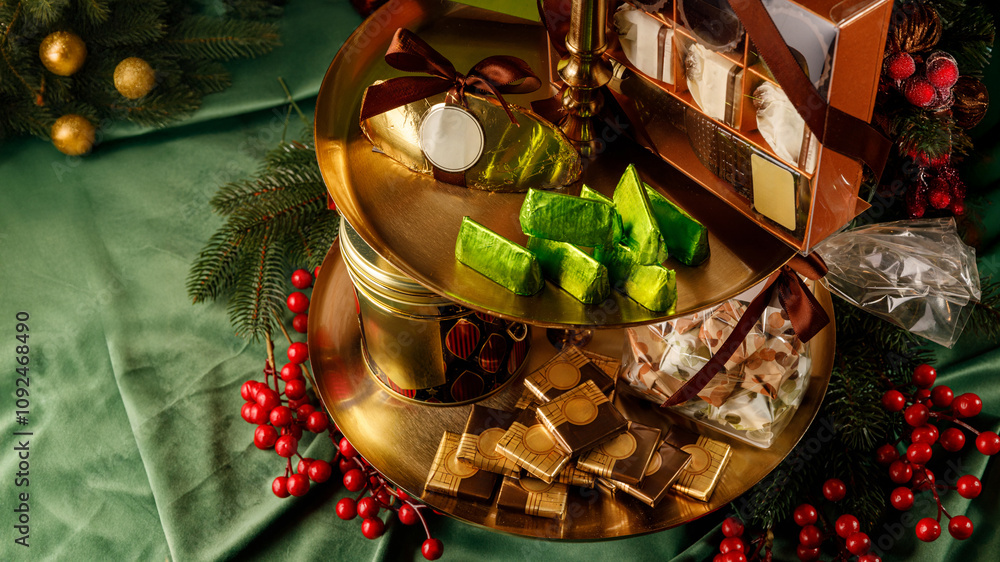 A beautifully arranged tray of colorful holiday candies and sweets, perfect for festive celebrations