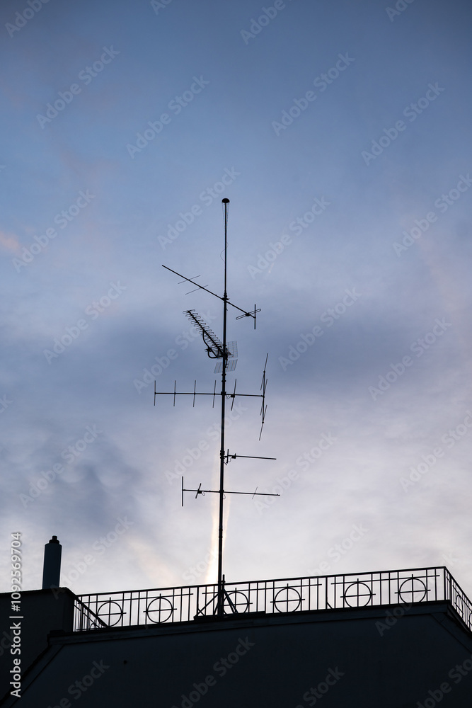 Rooftop mounted, old, TV signal capturing antenna on a residential building in Europe. Low angle view, no people